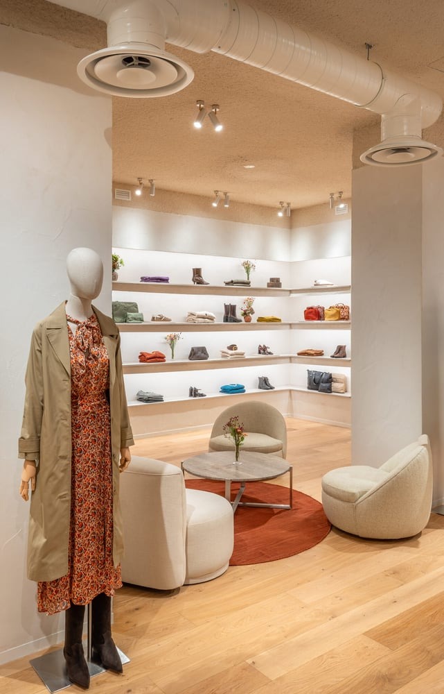 The décor combines elements such as Campaspero stone and wood, which lend warmth and authenticity, with brushed stainless steel, providing a more contemporary touch. The store also features glass details which, along with the lighting, create a tranquil and sophisticated atmosphere.
