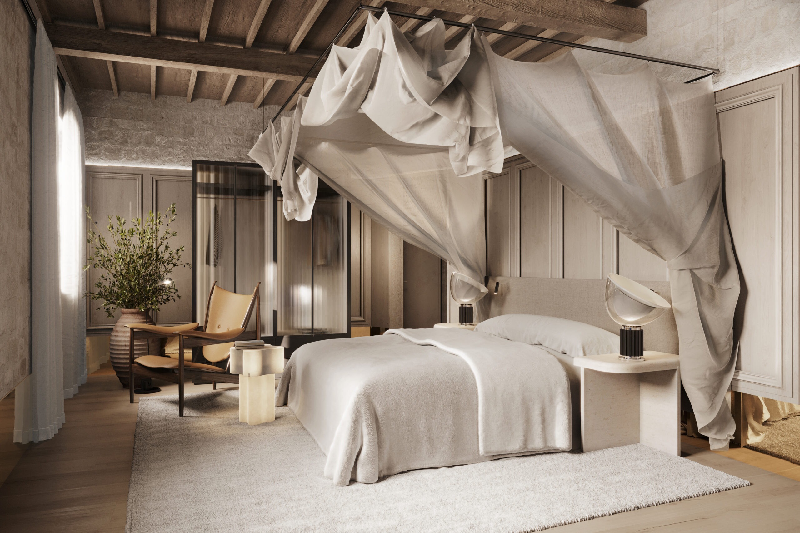 Where guests might expect rustic Tuscan charm, Chapter Chianti delivers something entirely unexpected. South African designer Tristan Du Plessis of Studio A has transformed the historic hamlet into a design-forward destination that challenges convention while respecting heritage. Rather than leaning into terracotta and antiques, Du Plessis employs clean architectural lines, exposed stone, sculptural lighting and modern Italian design pieces to create spaces that feel more urban lifestyle hotel than countryside retreat, yet remain deeply connected to the landscape and history of the site.