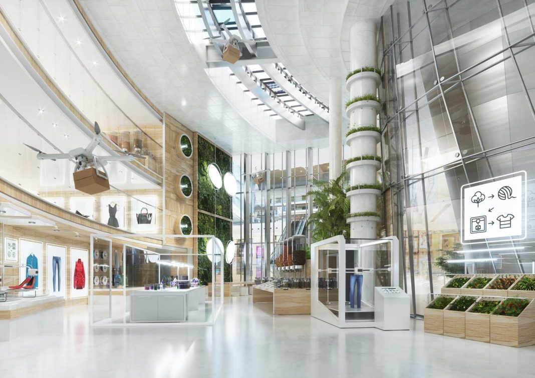 The store of the future will extend this self-sufficient approach and will include allotments on the roof to grow ingredients, a 4D-printing factory and studio allowing design teams to create product on demand. In addition, shoppers will be assured of zero-waste packaging solutions that will happen instore and will even be able to pay for goods through points programmes where customers are rewarded for their positive eco-friendly practices.