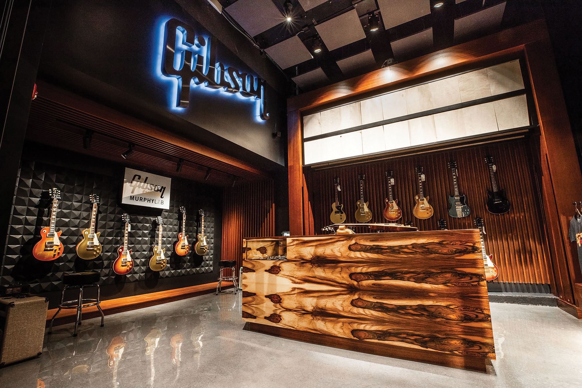 The Gibson Garage is first and foremost about delivering the experience that is expected of Gibson, at the highest quality standards, making everyone that visits us feel special and providing a space where fans can play and shop. A stunning and ground-breaking space, everything in the Gibson Garage is available to pick-up, plug-in and play.