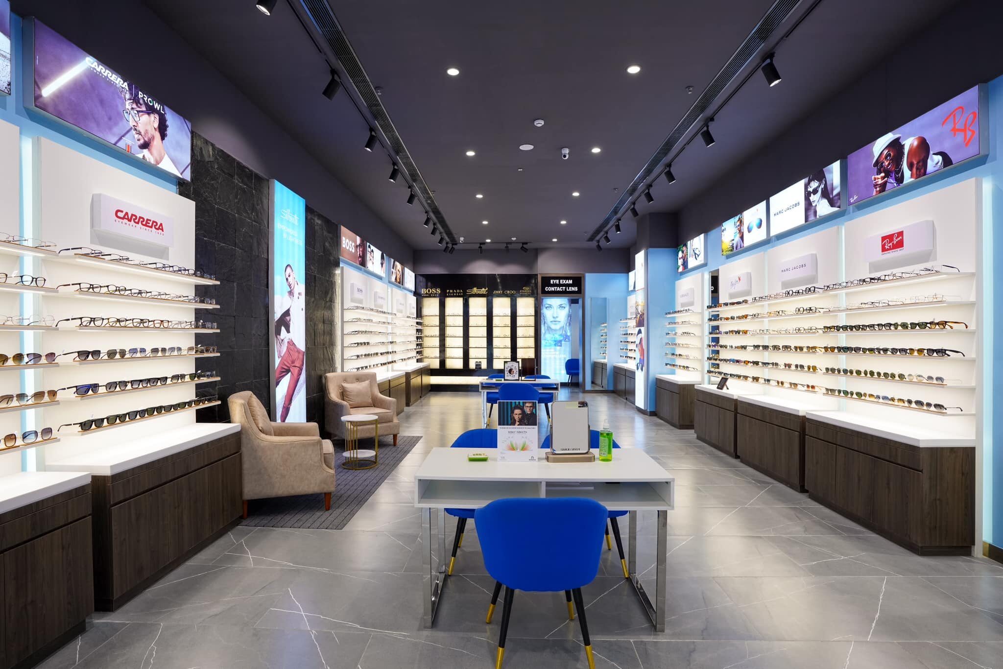 Brands that have a dedicated in-store area include Inspira, Lance Bremmer, Tommy Hilfiger, Carrera, Boss Hugo Boss, Jimmy Choo, Prada Eyewear, Silhouettes, Ray Ban, and Marc Jacobs among others. The store also retails contact lenses and has facilities for eye exams so shoppers can get their prescriptions and eyewear at the same place.